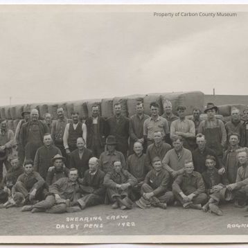 Update March 2011: Black and white print of a large group of men in informal rows with first row seated and semi reclining on ground, the second row is on their knees, third and fourth rows are standing. Stacked behind these men are large bales of wool stacked three hight with several rows seen in background. printed in white print as part of print: Shearing Crew Daley Pens 1922(center at bottom). Rogner Photo at far right corner. Men are dressed in various types of clothing including turtlenecks, coveralls, work shirts, and some with jackets, most are wearing hats or holding hats, some have then laying on their feet.