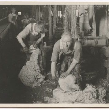 Update - 2009: A black & white print depicting the inside of a wooden sheep shearing shed. An extremely long narrow wood table? lines entire side wall. Men are bent over in a single long vertical row each shearing a sheep with hand clipping shears. The man closest to camera is gazing up while his right hand is clipping and his left hand is holding the lamb securely. He is wearing a cut off mid elbow length shirt. He has a protective apron which is tied to his legs over his pants. The upper chest piece is held by shoulder straps with metal buttons. To his left rear is a wooden tool box stacked on the rail of his stall area. Long batches of string are hanging down from ceiling above him and hanging down in progressive rows over other men in their small stall areas. A single young man in coveralls?, white shirt, and hat is seen standing left side background.