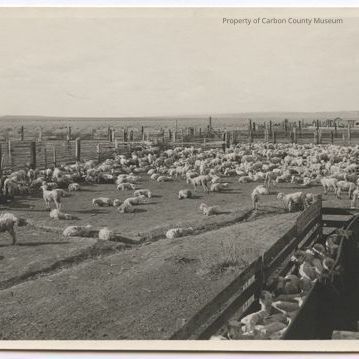 Update 2009: Black and white print of a large corral type pens with very large pens in center front filled with a large number of sheep standing and lying on the bare ground. Trench runs through the lot in foreground. a chute type pen is in bottom right foreground full of sheep. A barren flat horizon is seen in background. There are two copies of this print.