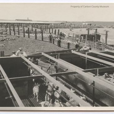 Update 2009: Black and white print of multiple sheep pens and multiple chutes with sheep seen lying on ground side left, corralled in pen in background, large number in long chute side right and others in spraying chutes in foreground. Various outbuildings seen in background and barren sagebrush covering ground on side right. Five men are standing by long chute. Two on farside, three in corral on chute near side. Two men are barely seen at lower center front on the outside of spraying chutes. There are two of this print.