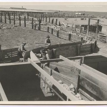 Update 2009: Black and white print of multiple sheep corrals, pens and chutes. Sheep are seen in the corrals in distance and center side left and in the long wooden chute being driven by several men up chute into a chute in the foreground. Outbuildings are seen in distance with barren acreage with sagebrush on side right. A wooden wagon is seen outside corral outer fence. There are 3 of this print .
