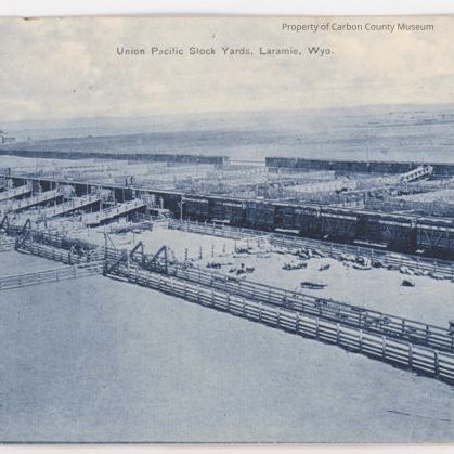 A postcard of the Union Pacific Stockyards, Laramie, WY. Grayish tone. Shows wide expanse of tracks. railroad cars, loading shutes fences and more.