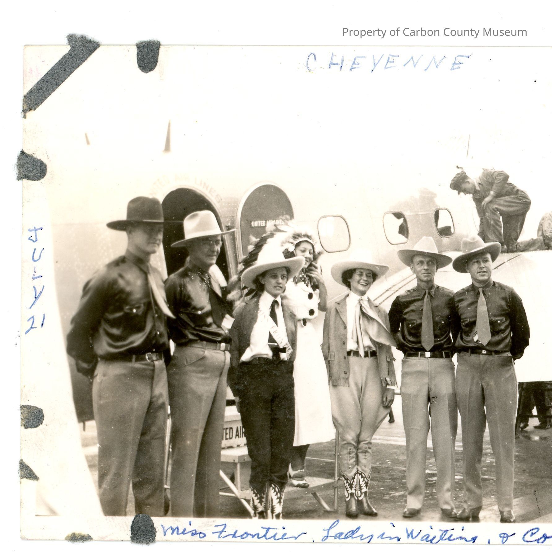 Black and white photograph. A group of people are standing outside of the entrance/exit of an airplane. Along the top of the photograph is written "Cheyenne", along the bottom "Miss Frontier, Lady in Waiting, + Commissioner with Sally", vertically along the left "July 21", vertically along the right "1933". The number 265 is printed on the reverse.Collection