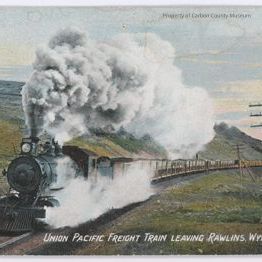 Photo of Union Pacific Freight Train leaving Rawlins, Wyoming. Steam engine. Used 1 cent postage. Engine number 1853?