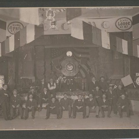 Black & white print on black mat. Image of 20 men seated on steps, man on far left leaning against piano. Banners of stars are on steps. Behind them is a depiction of a train engine with an American flag design over the top. On circle in the middle is: "87". Small flags fly at each side. On both far sides signs read "B of L F Summit Lodge No 87" with a flag beside each sign. Near the ceiling on left a sign reads: "Monday April 4th" On right: "Summit Lodge 87" Plain colored flags run from room corners to center overhead lights. Men are wearing suits & hats.