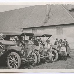 Update 2/2010: Black and white print. Snapshot. Image of a row of three vintage automobiles parked side by side on grass. Group of men, women and children interspersed between vehicles. Large frame house in background. First vehicle in row at left is right hand (English) drive.