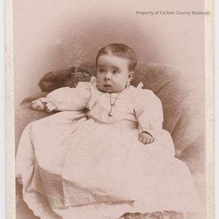 Update 5/2010: Black and white studio portrait on white mat of infant sitting on a chair covered with a blanket. Child is wearing a long white dress, possibly Christening gown. She has on a necklace and ring on her left index finger . Engraved on bottom: "Herbsts Studios" "R.H. Herbst" "Cumberland, Md".
