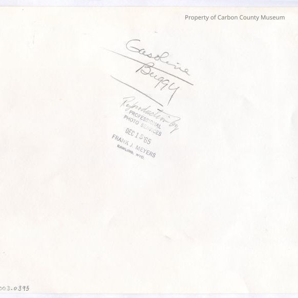 Update March 2011: Black and white glossy. Same as 1947.003.0028 but a different and closer view. Size 8 x 10. Black and white print attached to medium gray matboard of a large two story sandstone building with four large Grecian columns on the front wide porch supporting a second stroy open short white railing fenced terrace porch which overhangs the lower level porch and entryway. On building front at apex of roof beneath the top eaves is a large circular clock with wheat sheaths surrounding bottom and upper sides of outer edges of clock. Hands show 11:00 o'clock. to left of clock are large letters affixed to building: B.P.O.E. and to right of clock are letters and numbers: No. 609. There are two windows seen on building front. One on left and right of wide entry door. There are hansoms above these tall windows and the door. Ornate support brackets are positioned underneath eaves of roof edges sides and front and upper secondary eaves over second story terrace roof. In front of the building on the dirt street are three dark colored vintage open roofed automobiles all with light colored trees and side running boards. left to right: Car one has two men with hats in front seat and a single man in backseat. Car two has two men wearing hats and suits in front seat who are smoking cigars and a man wearing a hat with a cigar? in his mouth and his left arm around the back of the child seated next to him. The third car has two men in front seat, both wearing suits and hats. A man wearing a bowler type hat, cigar in his mouth seated next to a hatted child who is scrunched down in the seat. To rear of this last vehicle is a side street with the Ferris Hotel Bar sign seen in building window in background. There is a small house to left of BPOE. building that is obstructed by trees. Two little boys are standing outside picket fence watching the cars. Engraved stamp on bottom right corner "The Ferris Studio, Rawlins, Wyo."Collection