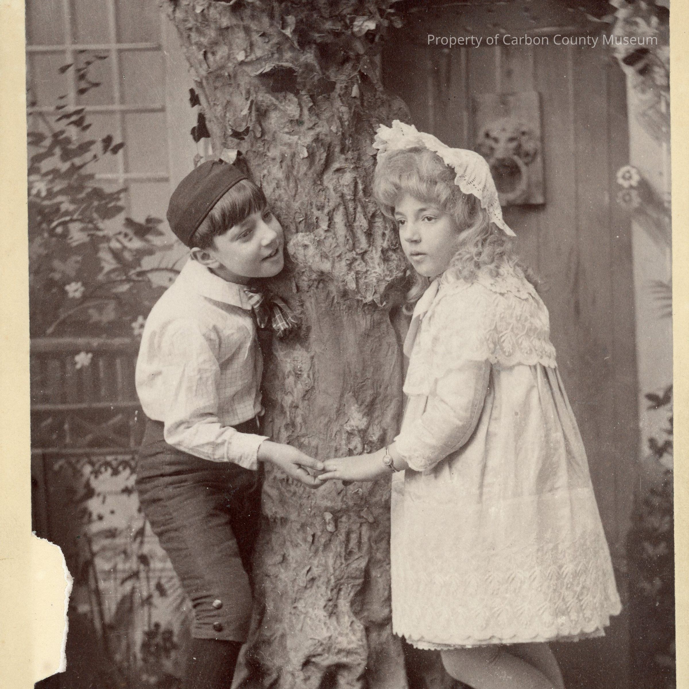 Black & white print on cream mat. Image of a boy & girl holding hands, her left & his right, in front of a tree, which is in a studio prop. A studio prop of outside of a house with door & window is the back drop. The girl wears a light colored lace dress, matching bonnet over blonde curls, light colored socks & dark shoes. The boy wears a dark cap, short pants, socks, shoes & a white shirt with printed bow tied at neck. His left hand & her right are behind the tree & their chests are next to the tree trunk.