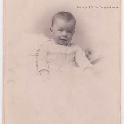 Update 5/2010: Black and white studio portrait on cream mat. Image of an infant sitting amid blankets. Infant is wearing a light colored, long sleeved dress with lace trim and tie at waist. Printed on bottom: "Baker & Johnson, Rock Springs and Evanston, Wyo." Back of card is pink.