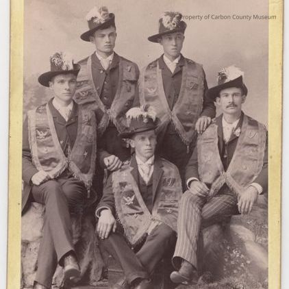Update 5/2010: Black and white print card on cream mat. Image of 5 men dressed in suits with a shiny fabric vest. Vest is decorated with a cross, an eagle and AOH. They are wearing black hats with the right brim folded up and decorated with a large feather in front. They could be a lodge or religious group of some kind. Printed on bottom: " E.E. Conrad Frostburg, MD." Back has decorative design of birds, butterflies, vines and leaves, sun, a fan and wood patterned on bottom.
