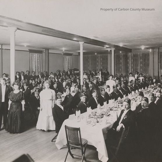 Update 2008: Black and white print. Snapshot. Mounted on grey matboard. Image of a large banquet with men seated at long tables. Ladies in white dresses standing in aisles and other men standing along left side wall of room. Man and woman standing at front end of center table. Most every man wearing a Korein Fez.