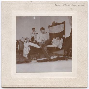 Update 2008: Black and white print. Snapshot. Mounted on patterned white matboard. Image of three men in shirt sleeves lounging on and around a bed. Smoking pipes. Tall headboard with lace hanging at top, a clock is hanging on the right post of headboard and hats are perched on the left top. Carpet under the bed with what appears to be a fur rug in foreground.