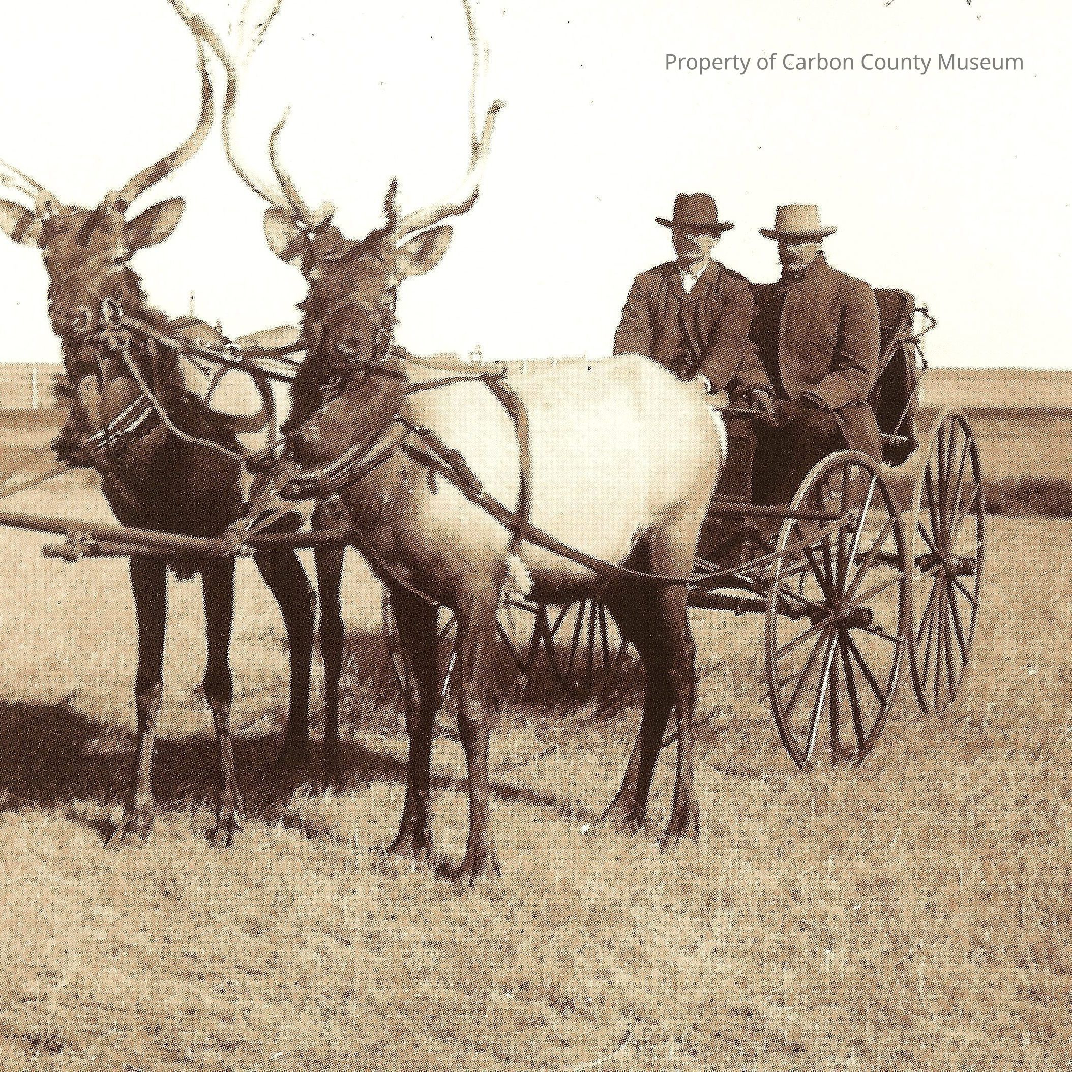 A black and white unused postcard print of two men wearing suits sitting in an open four wheel (large wooden) buggy which is hitched to a two team bull elk team. Open expanse of countryside is at the sides and background of scene. Good condition. Printed on back in black print at top left: Wapitis Hitched to Buggy This unusual photograph shows a pair of elk with impressive antlers hitched to a buggy belonging to a buggy belonging to C. H. Shields. it was taken near Edgelay, North Dakota. The term "wapiti" is a Shawnee term meanaing "white rump." Photographed in 1893 by hiram H. Wilcox. (other print matter is on the card at side left). UPC code is at top right corner with spaced five lines underneath on the right side. New condition.Collection