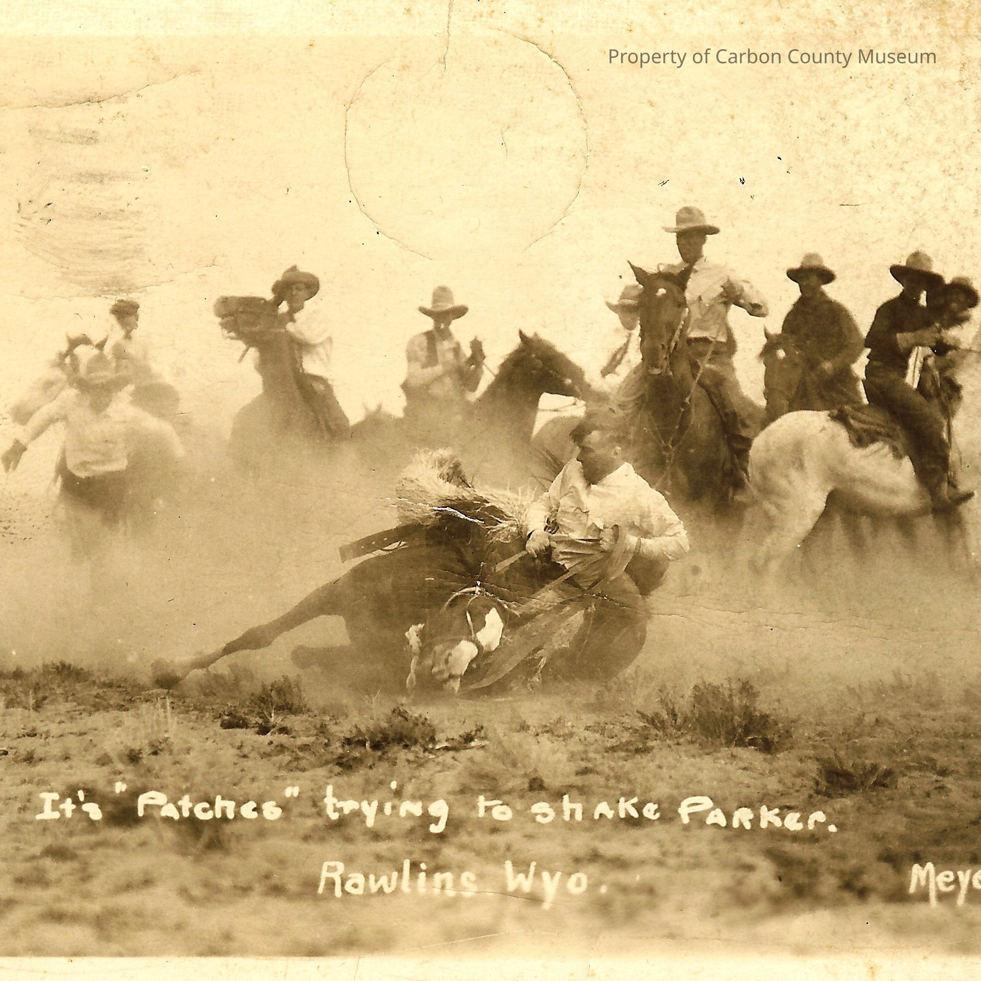 A black and white print card/ Image of a rodeo, a bronc rider and his horse are on the ground. The horse's front right leg is outstretched and he is laying on his left side. The head of the horse is turned with his nose toward the ground. The cowboy is on the left side of the horse and his left leg at the horse's back. He wears angora chaps, but has lost his hat. A cloud of dust is behind them and the mounted cowboys. Two are on the ground running toward the downed bronc rider. Printed in white on the original negative on the bottom: "Look at em! It's Patches trying to shake Parker. Rawlins, Wyo. 2 Meyers Photo." Printed on back in black Post Card Correspondence Address Postmark is a black circle with : "Rawlins, Wyo. Aug 26, 7:30 p.m. 1925" printed inside the stamp : United States Postage 2 cents" In pencil: "Aug. 26, 1925 Rawlins, Wyo. We well {sic} getting along fine. Fred is with us. D. F. H. " Addressed to: Miss Arminda Haskins Boscobel, Wis. Condition good; emulsion impacted by postal cancellation, creased top right corner and horizontal rainbow emulsion creasing' scratched, soiled with dark spots upper right side, vertical creases on bottom edge and lower right corner.Collection