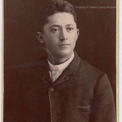 Update 5/2010: Black and white studio portrait on cream mat of man wearing a trimmed dark jacket with top button fastened, white shirt and patterned tie. He has dark hair combed back. Printed on bottom in gold: "Berkemann 1313 S. Adams Street Peoria, Ill." Edges are trimmed in gold.