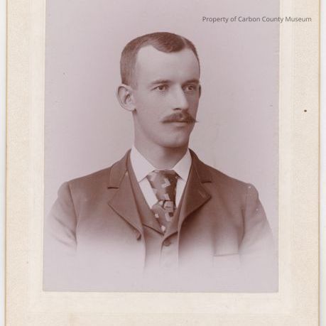 Update 5/2010: Black and white studio portrait on cream card of a man with dark hair and mustache wearing a 3 piece suit. Suit is dark with cloth covered buttons, patterned tie and white shirt. Printed on bottom in green: "James, Des Moines, Iowa". Edges are trimmed in gold. Smooth border around print with textured outer border.