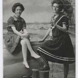 Black & white print card. Image of two women dressed in dark sailor dresses, trimmed with white stripes. Woman on left has on light colored striped socks & is sitting on a studio prop with her hands around her left knee which is crossed over her right leg. Her hair is dark & upswept. Woman on the right is standing & has on polka dot socks & holds a parasol over her shoulder in her left hand. Her right foot is on a piece of wood. An ocean scene is in the background.