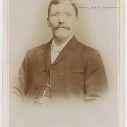 Update 5/2010: Black and white studio portrait on white card of a man in dark suit. He has dark parted hair and a mustache. His jacket and vest have piping trim and cloth buttons. He has on a white shirt and white bow tie with small pattern on side. A watch fob and chain are attached to his vest. Printed on bottom in blue: "A.A. Brown Photographer, Rawlins, Wyo."