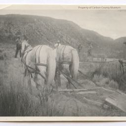 Written on back in black ink: Early day road building. Team of horses pulling a scraper.