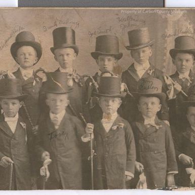 Update - January 2010: Sepia print. Studio portrait. Mounted on black matboard. Image of 12 boys in top hats & tails with canes, posed in front of a painted backdrop.