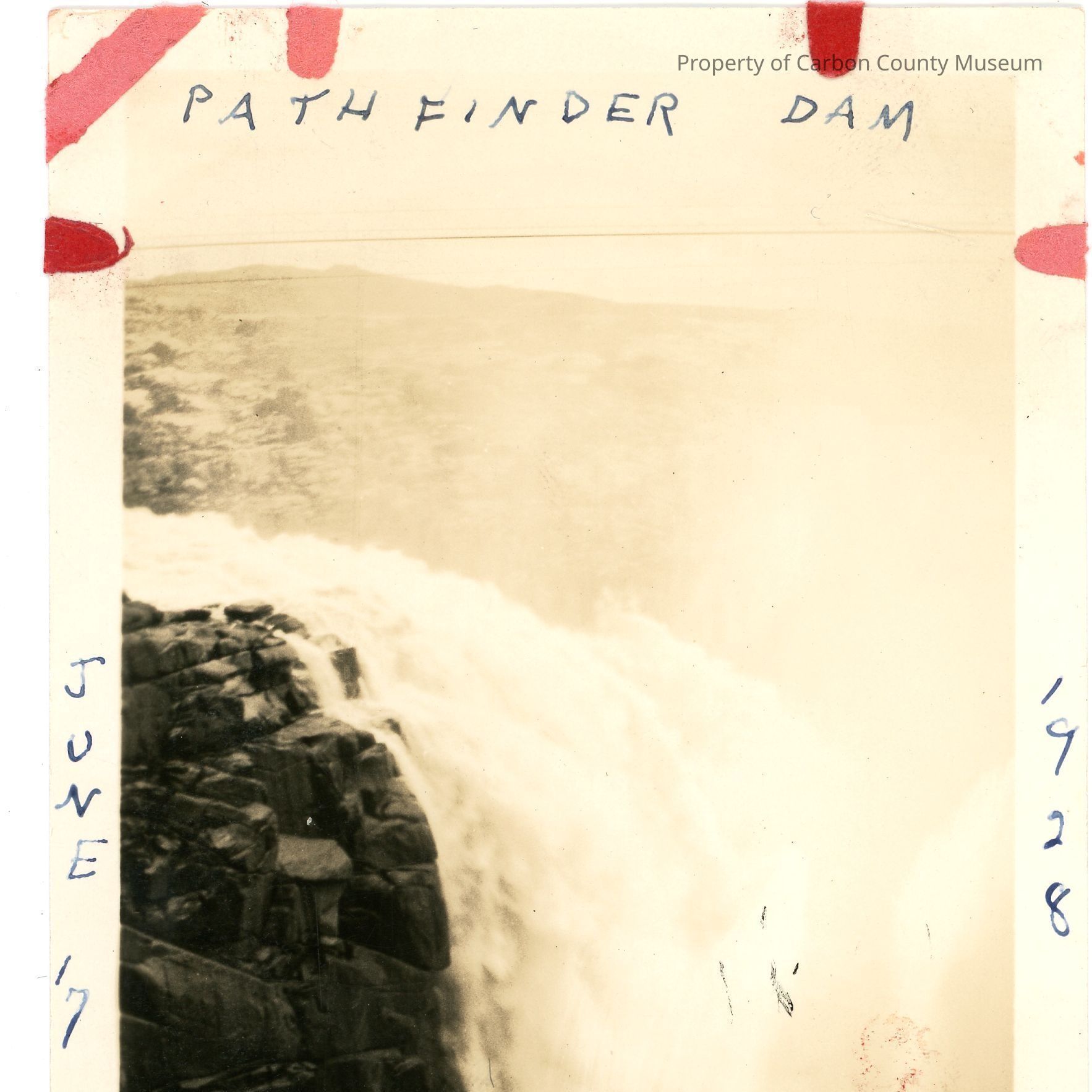 Sepia tone photograph. Rushing water falling over a rock formation into a pool below. Written along the top edge of the photograph is "PATHFINDER DAM", along the bottom "SIDE VIEW OF WAST WA", vertically along the left "JUNE 17", vertically along the right "1928". The number 15 is printed on the reverse, also present is a circular green stamp that reads "MEYERS PHOTOS PHOTO FINISHING RAWLINS, WYO".Collection