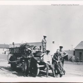 Written on back in blue ink: "Matt Siray, Bill Humphrey, Jimmy Jensen, Walt Lambertsen with 1917 American LaFrance"
