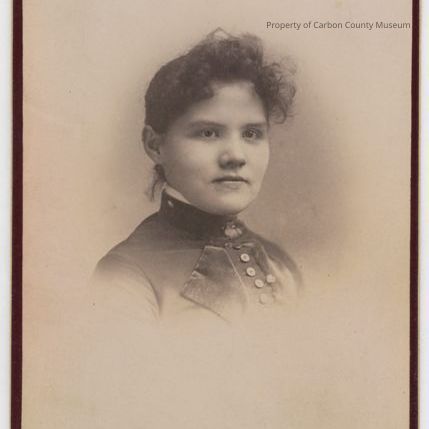 Update 5/2010: Black and white studio portrait on dark brown card. Image of a woman's head and shoulders wearing a heavy dark top with stand up collar and white underlay. There is a flower brooch at neckline and round button down the front with another flower pin beside buttons. On sides of buttons a triangle shape fabric is sewn on like lapels. Her hair is pulled back except for curly bangs. Printed in gold on bottom: "T.L. Darnell, 1889 Cumberland, Md."