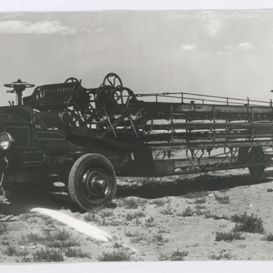 Black & white glossy print of a very long fire truck. Painted on the side rail: "Fire Department No A" The front of the truck is dark & has a horizontal steering wheel, roll & tuck upholstery seat, a horizontal tank beneath seat. Long rails continue to back where a seat & horizontal steering wheel are on top. Truck sits in a dirt field with sparse vegetation