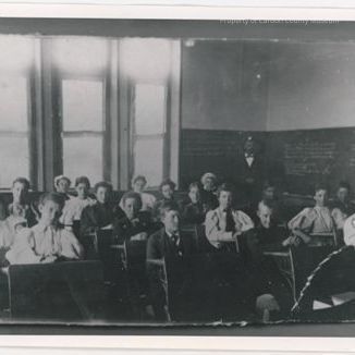 Black & white copy print of the interior of a classroom. Students are seated at desks in five rows. There are three tall windows in photo background & blackboards on photo right. A man stands behind students in corner of the classroom. A framed picture hangs above the blackboard.