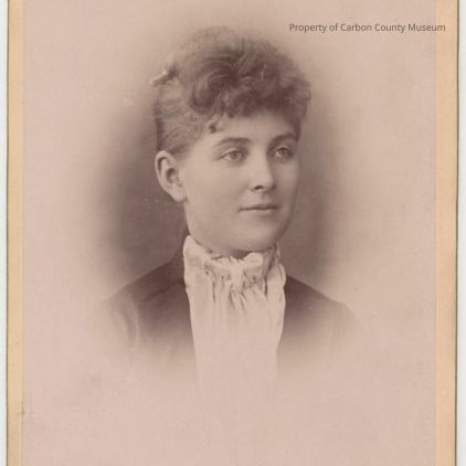 Update 5/2010: Black and white studio portrait on cream card of woman's head and shoulders. She has on a dark jacket with light colored silky looking blouse that has a high gathered neck. Her hair has soft curls at front and top and remainder is pulled back. Printed at bottom in black: "A.A. Brown Rawlins, Wyoming."