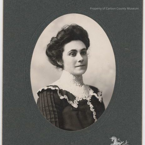 Update 5/2010: Black and white oval studio portrait on black mat. Image of woman's head and shoulders. She is wearing a dark dress with series of pleats on arms, lace high collar extending over shoulders with trim on edges of dark ends of collar and extending down the dress front. Her hair is curled nd puffed up and back. Embossed on lower right corner in white: "Haverstich, Frostburg, MD." Written on back in blue ink: "Annie".