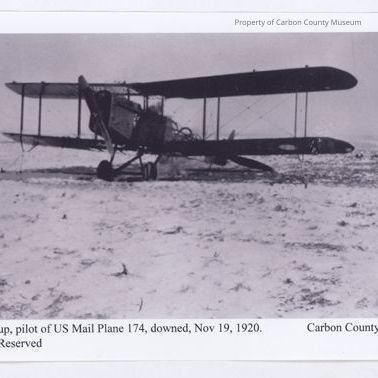10. Side view of bi-wing airplane, nose is in the air, dark smoke billowing from under wings & back. Printed in white on photo bottom: "Mail plane 174 Rawlins, Wyo Nov 28, '20" Written on back in black: "5A".