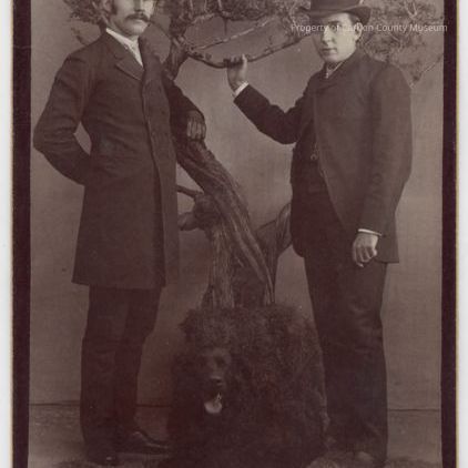 Update 5/2010: Black and white print on black card. Image of 2 dapper looking gentlemen wearing dark suits. Man on photo left has long tailed jacket, white shirt, print tie, gloves and tall crown top hat. Man on left has watch fob and chain attached to his vest. His right hand is on a studio prop tree limb. He wears a Derby hat. There is a black dog laying on the floor between them. Printed on bottom in gold: "Brown Rawlins, Wyo." Edges in gold.