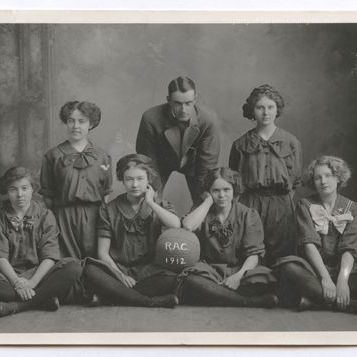 Update March 2011: Black & white print of six girls & one man dressed in a suit. He is in back row leaning forward. A girl is on each side of him on her knees. Four girls are sitting cross legged in front of them. The girls wear dark 3/4 length sleeve uniforms with dark bows at their neck. Girl on far right has a white bow & a sailor collar. They are wearing dark socks. On the basketball in front of them in white: "RAC 1912"