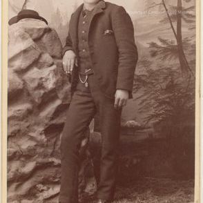 Black & white studio portrait print on cream colored mat. Image of a man standing wearing a three piece suit, medium colored shirt & dark tie. There is a handkerchief in his left jacket pocket & a watch fob & chain in the bottom vest button hole. There is a ring on his right pinky finger. His hair is dark, parted on his left & he has a thin mustache. the studio prop background is an outdoor scene with a large rock. His right arm is resting on the rock & his hat is on top of the rock.
