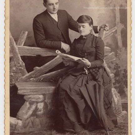 Update 5/2010: Sepia studio portrait on cream mat. Image of a man behind a studio prop wood fence looking at a newspaper being held by a seated lady on opposite side of the fence . he is wearing a dark jacket, vest and white high collar shirt . She has on a dark long dress with fitted top, pleats and buttons and a brooch at neck on collar. A chain is hanging from her dress below bust and a parasol is leaning against her left leg with decorative handle upright. Edges trimmed in gold and scalloped. Printed on bottom in gold: "Choate Cumberland, Md." Printed on back: "Duplicates can be procured at anytime. Special attention given to all kinds of portraiture in crayon, ink, oil, or water color S.C. Choate, Cumberland, MD." Printed in and around very decorative pattern of vine and flowers, artists pallet, moon lit scene and wood border.