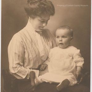 Sepia studio portrait print of a woman with an infant on her lap. The woman is wearing a dark skirt, light colored striped blouse with jabot. Her hair is dark & bouffant on sides & top pulled into a loose bun on the top back of her head. The child is sitting up & wears a light colored, long sleeved gown with eyelet slip underneath & light colored shoes.