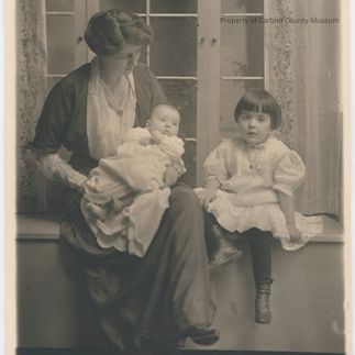 Sepia contact print of a seated woman holding an infant & seated next to her is a very young girl. The woman wears a dark dress & a light colored blouse with a brooch , a chain & dangle necklace. The infant has on a light colored gown & is wrapped in a light colored blanket. The girl is wearing a light colored lace collar & hem lined dress. She wears a necklace, dark socks & button up tall shoes. Her hair is straight with bangs & cut by ears around to back. Background is a large window with handle pulls & sheer curtains behind the bench on which they are sitting.