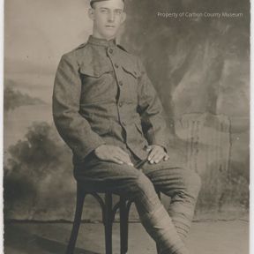 Sepia studio portrait print of a man seated in a wood chair. He is wearing a heavy wool looking uniform. He wears an Army cap & his lower legs are wrapped in gaiter straps. His right leg is crossed over the left at the ankle & he wears lace up boots. the background studio prop is an outdoor scene.