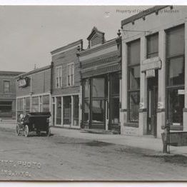 Written on back in pencil: "Exterior Rawlins business houses. " Written on back in black ink: "Front street Rawlins". On white adhesive tag : "Rawlins Businesses".