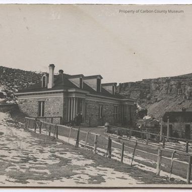 Update - 2009: A black & white print attached to light colored mat which has been cut off leaving irregular edges. Print shows an ornate house built of irregular shaped rock with wooden gables protruding from roof, side & front. Windows of house are narrow & high. Front of house has multiple columns on side left entryway & matching columns on side right entryway. Several small rock outbuildings are seen on right side. The house is built into an arid hillside with a high butte type cliff seen on side right. An incline driveway has irregular shaped post fence on side left & a more uniform square post built fence with wire on side right of road bed. Light snow patches are seen on side left. A group of three women are standing on entryway side left & a man is seated on the steps with a black dog nearby. A man & a woman are standing on entryway side right each on one side of the portico.