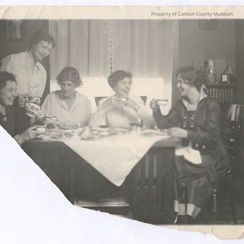 Update 2/2010: Black and white print. Snapshot. Image of a group of five women sitting at a table having coffee or tea and snacks. Table is draped by a small square light colored cloth on the diagonal. Window with sheer curtains, bookcase with knick-knacks on top and framed pictures on the wall in background. Four of the women are seated-two on back side and one on each end. The fifth woman is standing at the back left pouring from a teapot.