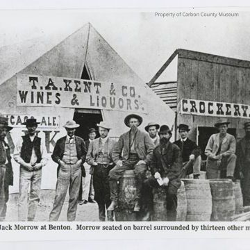 Printed in black on bottom border: "Jack Morrow at Benton. Morrow is seated on barrel surrounded by thirteen other men".