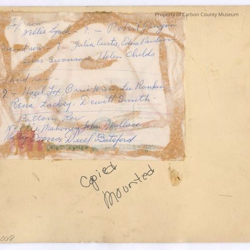 Written in blue ink on paper pasted on back" "top row Nellie Lynch - ? - Robert Ganyan Second row - ? - Julia Curts Edna Paulson Silas Swanson Helen Childs" "Third row - ? - Hazel Fox Orrie Wren Lee Rankin Rena Lackey Dewett Smith" "Bottom Row Nellie Mahoney John Wallace Katy Evans Duel Batsford".
