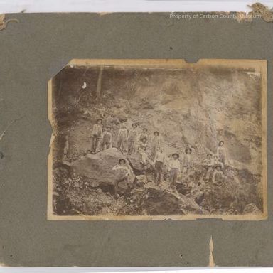 Update 2008: Sepia print. Photo of men on the side of a hill. Some have sledge hammers in their hands. There appears to be 15 men with most of them in overalls and long sleeved tops. All but two have on hats. Three have on jackets.