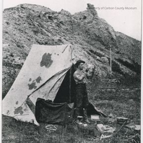 Typed on negative: "The photographer and his working outfit along the line of the Union Pacific Railroad in 1869. The developing box is on the ground in front. The tent was used for both work room and living quarters."