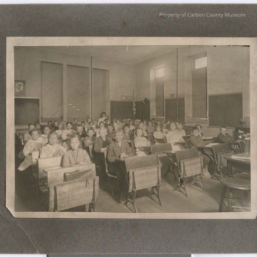 Update - January 2010: Black & white print. Snapshot. Mounted on grey matboard. Image of a school classroom with young students seated at their desks. Teacher is seated in the back of the room. Corner of a desk with vase of flowers & stool at right foreground.