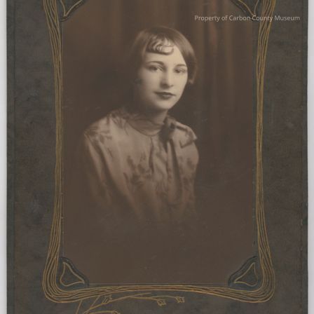Update 2008: Sepia print. Bust photo of a young lady in a dark floral print. Collar is tied to the right side of neck. Lady has dark hair that is cut short and has a wave form on her right forehead. She has on lipstick and makeup.