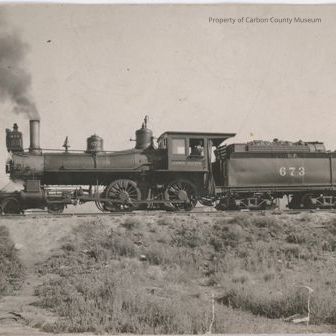 Black & white print of a steam locomotive. Smoke is coming from the stack & a man/s back is at window. Under window is: "Union Pacific" and on coal car is "U P 673"